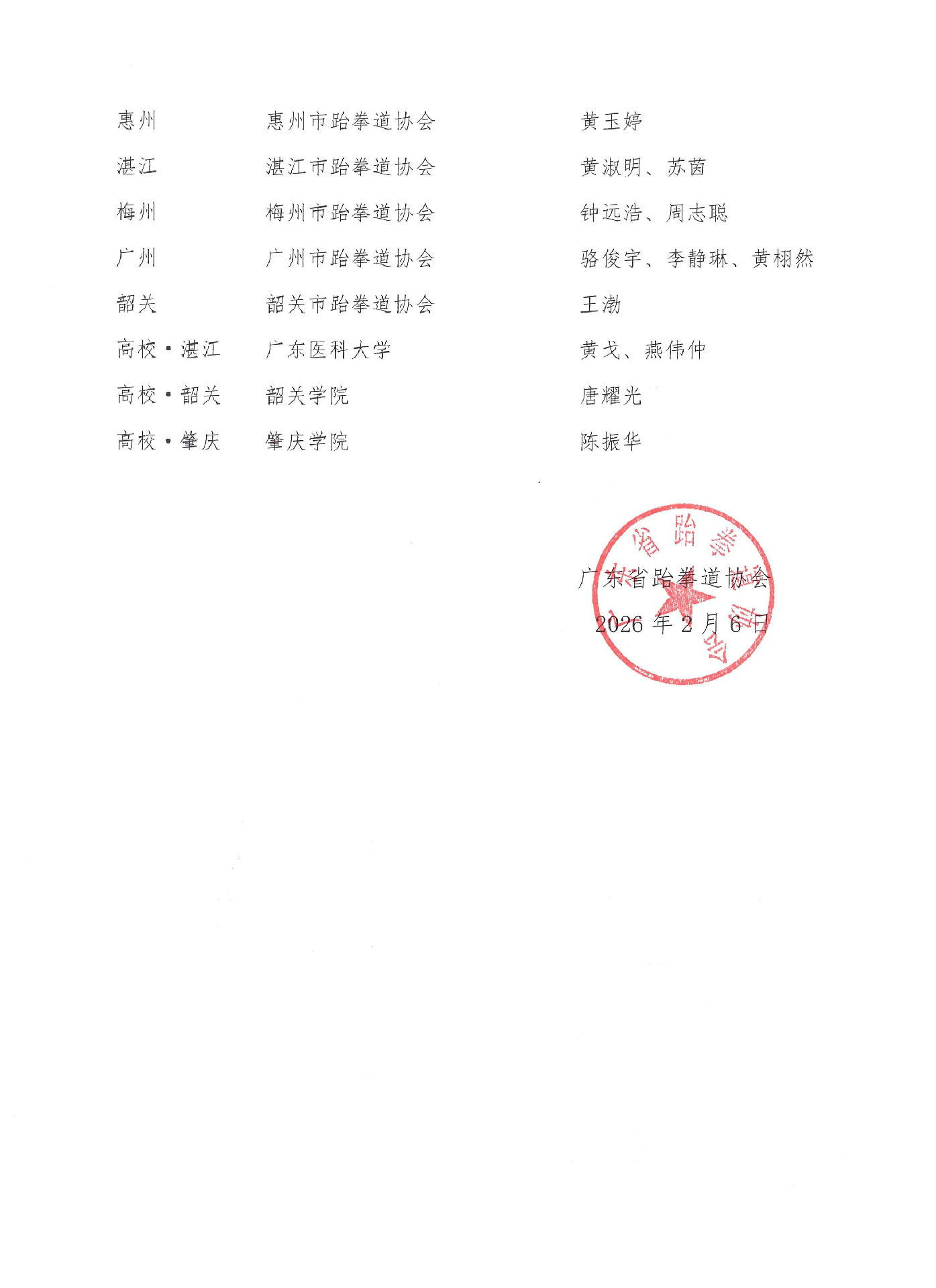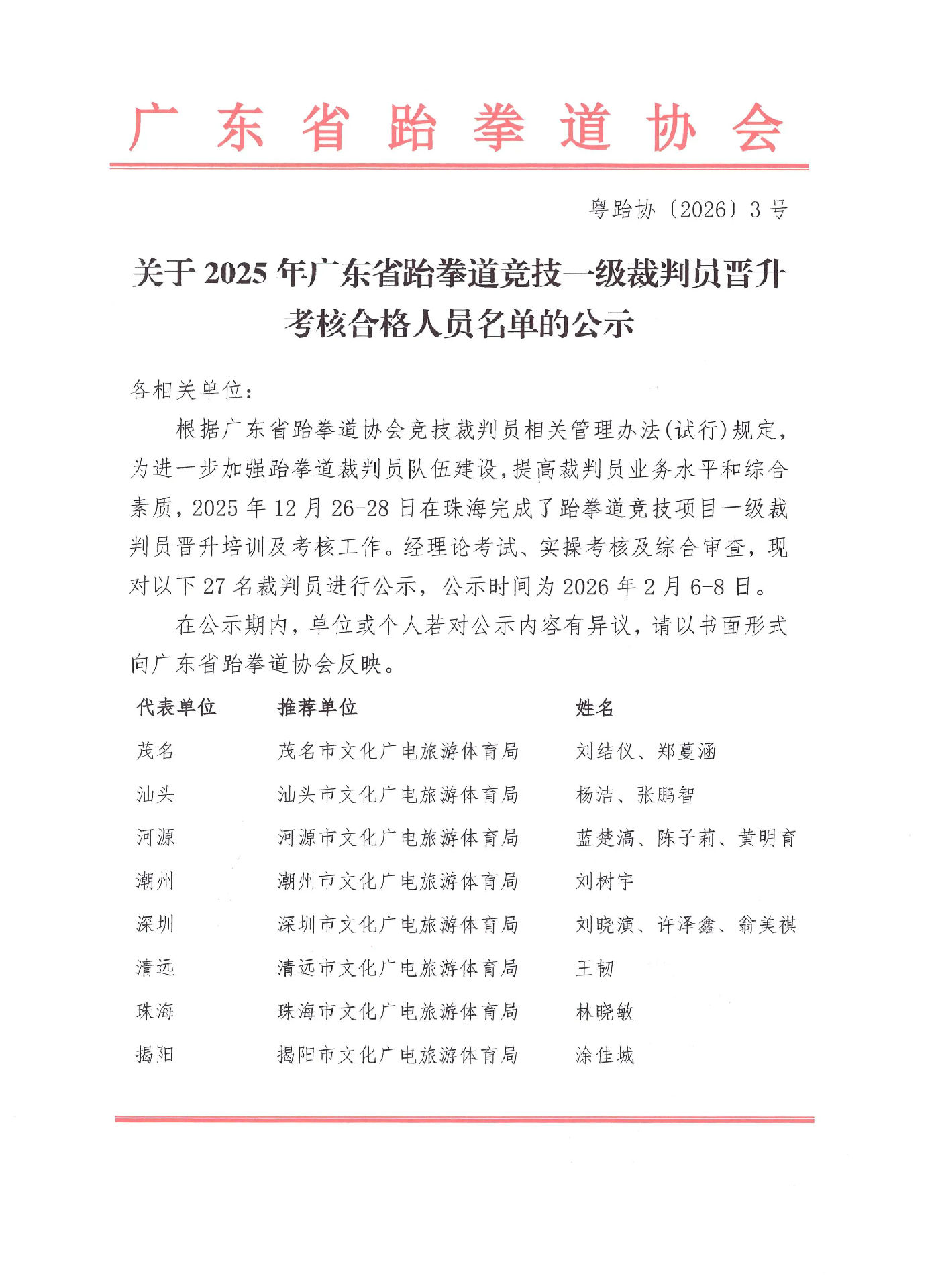 关于2025年广东省跆拳道竞技一级裁判员晋升考核合格人员名单的公示